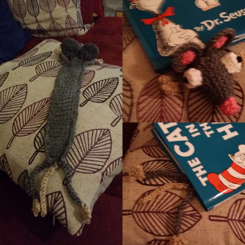 This Crocheted Rat Bookmark is cute, some people may not see the humor in it but I do. Supergurumi.com has a lot of cute patterns. I first saw this one on Facebook, my husband said he wanted it for a log book at work so I went to work. This takes very little yarn to make, you will need a little bit of stuffing for the head.
