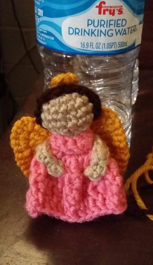 For mine I used 3.75 hook, and I did less “rows” in her head. The first one’s head was to long for my liking. You can see I also added some details to it. Arms, dress collar, hair, halo.
