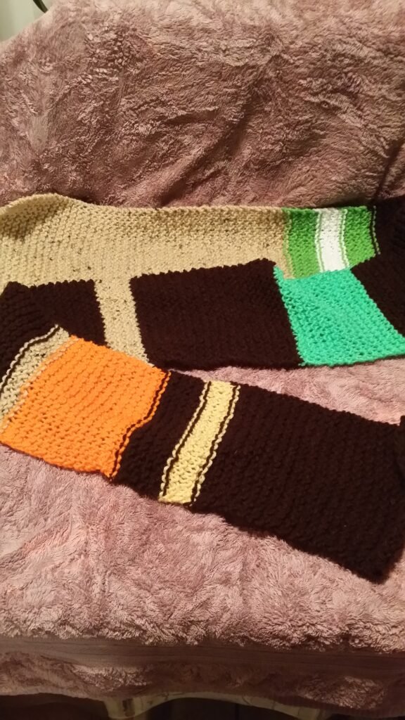 I did not follow a pattern, since there wasn’t any for a burrito scarf, so I just started knitting in the brown for the meat and just kept it rolled so I could see when I needed to change colors. My color choices were based on whats in most burritos: meat=brown, orange=cheese, light green= lettuces, dark green = avocado, white=sour cream, light brown=tortilla.